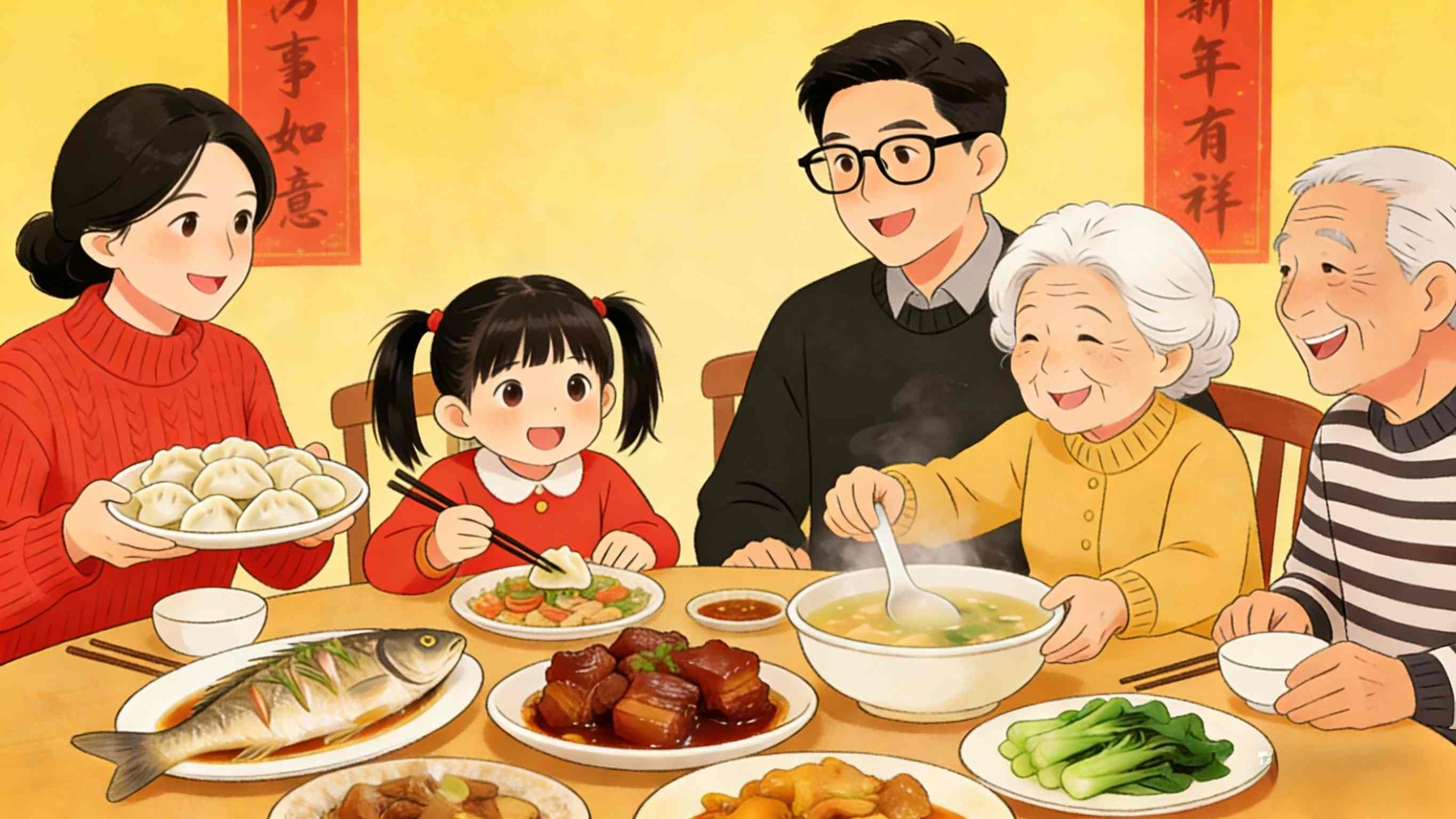 30. januarja zvečer, zadnjega dne v letu po kitajskem koledarju, se družine zberejo na skupni večerji, kjer v družbi drug drugega delijo toplino in veselje.